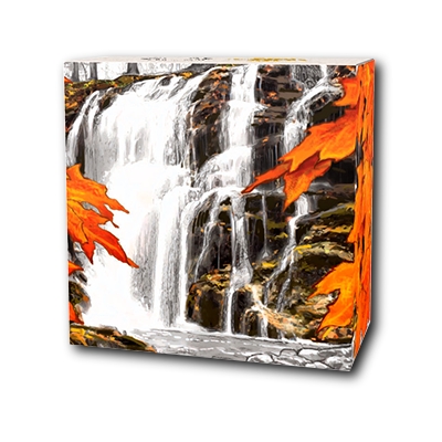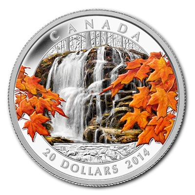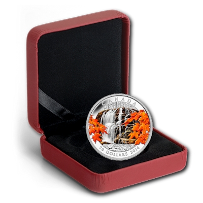 Der „Indian Summer“ ist eine der bliebtesten Reisezeiten in Kanada. Kein Wunder, schließlich präsentieren die Wälder an der Ostküste auch eine einzigartige Vielfalt an leuchtenden Farben. Golden und orange ragen die Zuckerahornblätter auf dem Motiv der Silbermünze von den Seiten her ins Bild, dazwischen sprudelt ein durch aufwendige Prägetechnik zum Leben erweckter Wasserfall über bemooste Felsen. Oben ist ein in Silber gestalteter Wald zu sehen; vereinzelt leuchten die Baumstämme hell auf, als würde von oben ein Sonnenstrahl durch das herbstliche Blätterdach fallen. Bei der Gestaltung dieser in Proof-Qualität geprägten Silbermünze lässt die Prägeanstalt wirklich ihr ganzes Können spielen.