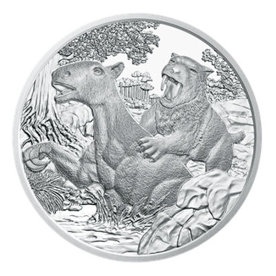 Auf der Rückseite der Silbermünze ist die Säbelzahnkatze in Action zu sehen: Sie hat gerade ihre Vorderpfoten in ein Krallentier (Chalicotherium) geschlagen und das Maul zu einem tödlichen Biss geöffnet. Auch die Krallentiere sind typische Vertreter der Fauna im Tertiär: Sie wurden über zwei Meter groß, hatten einen kräftigen Oberkörper und klauenbewehrte Füße. Sie sind Vorfahren der heutigen Nashörner, konnten sich aber vermutlich gut auf die Hinterbeine aufrichten, um an Blätter heranzureichen. Die Landschaft im Hintergrund gleicht schon der heutigen: Laubbäume, Gräser und Wiesen bilden den Rahmen für den Kampf.