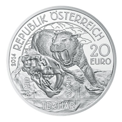 Das massenhafte Aussterben der Dinosaurier am Ende der Kreidezeit verhalf im Tertiär, das vor rund 65 Millionen Jahren begann, den Säugetieren zum Durchbruch. Im Laufe des Zeitalters kühlte die Erde ab, die Auffaltung der großen Gebirge wie Alpen und Himalaya begann und schließlich zog sich das flache, warme Meer aus Europa immer weiter zurück. Das heutige Österreich wurde vor ca 11,5 Jahren zum Lebensraum für große Landtiere wie die Säbelzahnkatzen. Die Vorderseite der Münze zeigt über dem Zeitstrahl einen Schädelfund, der heute im Naturhistorischen Museum in Wien zu sehen ist und aus dem das Aussehen der mächtigen Katze rekonstruiert wurde.