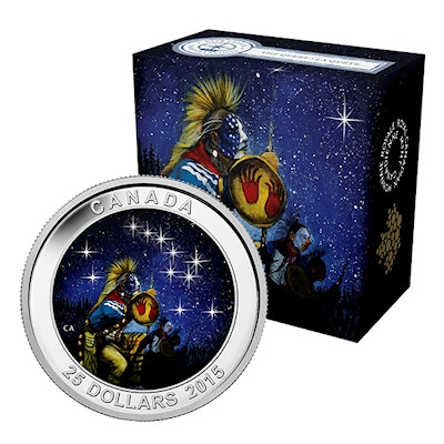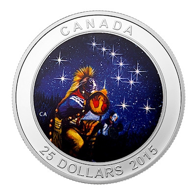 Für die Ureinwohner Nordamerikas bilden der Bär und seine ewigen Jäger heute das Sternbild Großer Wagen, das das ganze Jahr über zu sehen ist. Das Motiv der Silbermünze zeigt einen Nachhimmel mit elf funkelnden Sternen und Jägern in der traditionellen Tracht der Ojibwa im Vordergrund. Im Dunkeln leuchtet das Sternbild dank einer speziellen Leuchtfarbe, die auch im Lauf der Jahre nichts von ihrer Strahlkraft einbüßen soll- es genügt, die Münze im Licht wieder „aufzuladen“.