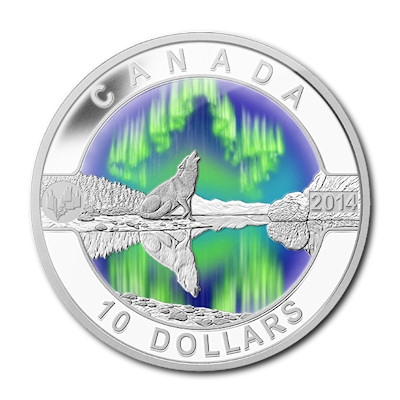 Eine besondere Ausgabe erwartet die Münzsammler in der Serie O Canada 2014 aus 1/2 oz Feinsilber: Die neunte Edition der beliebten Silbermünzen ist mit Farbapplikationen gestaltet. Sie zeigen den grün funkelnden Vorhang der Aurora borealis über einer arktischen Landschaft in Silber, wo ein einzelner Wolf in die Nacht heult. Insgesamt 40.000 dieser Sammlermünzen werden ausgegeben.