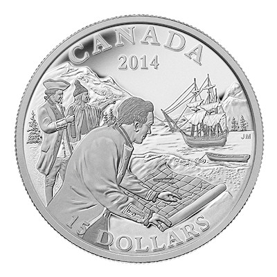 Die Silbermünze zeigt im Vordergrund einen Offizier, der sich über eine Karte beugt. Offensichtlich erkundet die Truppe gerade eine Bucht, in der das Schiff vor Anker liegt. Im Hintergrund ragen Berge auf. Unten ist der Nennwert von 15 CAD verzeichnet. Die in höchster Proof-Qualität geprägte Silbermünze hat einen Durchmesser von 36,07 Millimetern und enthält 23 Gramm Feinsilber. Der Feingehalt beträgt 99,99 Prozent. Ausgeliefert werden diese Sammlerstücke im Etui mit Umverpackung und nummeriertem Echtheitszertifikat. Nach den Voygeurs, Gold Rush, Arctic Expedition und Vikings ist diese die fünfte Ausgabe der zehnteiligen Münzserie.