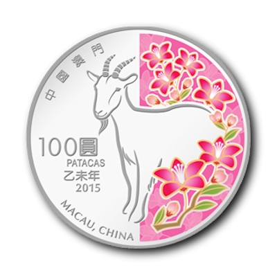 Ein gemütliches und harmonisches Jahr erwartet die Welt, wenn man der chinesischen Astrologie Glauben schenken will. Die Ziege gilt als sanftmütig, elegant und kreativ. Gewaltsame Auseinandersetzungen widerstreben dem Charakter der Ziege, außerdem hat sie einen ausgeprägten Gerechtigkeitssinn. Harmonie strahlt auch das Motiv der Silbermünzen aus Macao aus, die von der Singapore Mint geprägt werden. Die Vorderseite ist zur Hälfte koloriert und zeigt üppige Rhododendronblüten vor einem rosafarbenen Hintergrund. Zwischen den Blüten steht die Ziege, die nur als Silhouette gestaltet ist. Ihre Vorderteil ragt in den silbernen Bereich der Münze, wo auch der Nennwert zu finden ist.