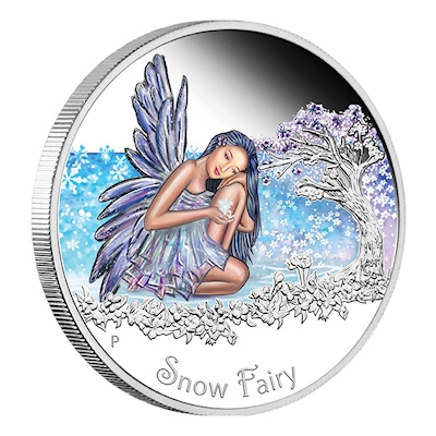 Schneeflocken, die glitzern wie Kristall und ein blühender Kirschbaum: Die Silbermünze vereint gegensätzliche Symbole in ihrem Design. Im Vordergrund kniet die Schneefee, eine junge Frau mit langen schwarzen Haaren, einem sommerlich kurzen Kleidchen und gefiederten Flügeln wie ein Engel. Der Hintergrund mit den wirbelnden Schneeflocken ist eisblau gestaltet, die Snow Fairy selbst in zarten Farben gemalt, ihr fein gezeichnetes Gesicht ist dem Betrachter zugewandt.