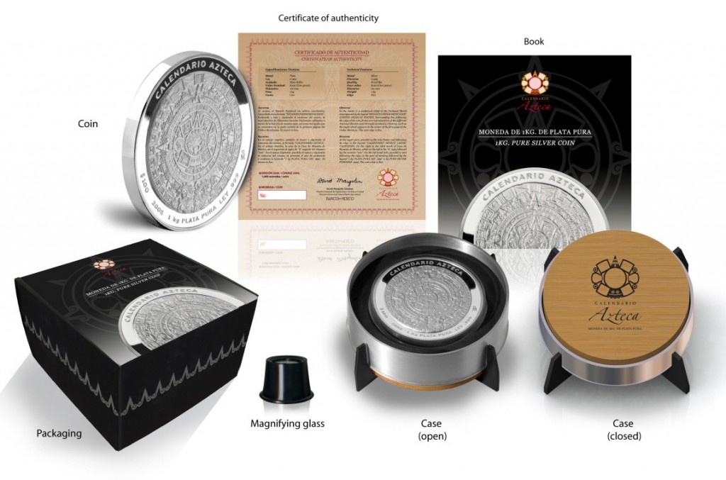 Die Silbermünze hat einen Durchmesser von 110 Millimetern und trägt den Nennwert von 100 Pesos. Damit man die Details des Motivs auch würdigen kann, wird sie mit umfangreichem Zusatzmaterial geliefert: Der Ständer der metallenen Schatulle mit Holzdeckel sorgt für eine stilechte Präsentation, mit einem Vergrößerungsglas lässt sich ganz genau hinsehen und das das zugehörige Booklet informiert über die Hintergründe des Kalenders. Ein nummeriertes Echtheitszertifikat gehört ebenfalls mit zum Lieferumfang.