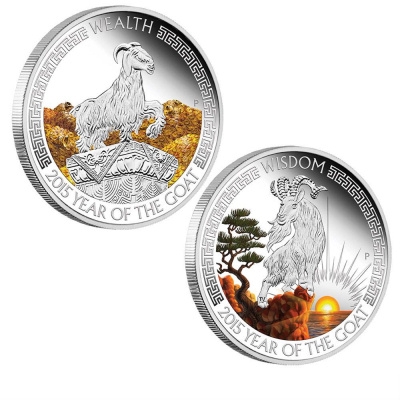 lunar-good-fortune-wealth-and-wisdom-setDas Jahr der Ziege, auch bekannt als Jahr des Schafs, beginnt am 19. Februar 2015. Deshalb sind die schön gestalteten Lunar-Münzen ein ideales Geschenk zu Weihnachten oder Neujahr. Jede der beiden Münzen, die aus einer Unze Feinsilber (Feingehalt 999/1000) geprägt sind, zeigt ein leuchtend koloriertes Motiv: Unter der Überschrift „Wealth“ sieht man eine Ziege wie eine Statue auf einem Podest vor einem Hintergrund angehäufter Goldmünzen stehen. Detailreich ist das Fell der langhaarigen Ziege gestaltet, die Schatzkammer im Hintergrund würde Dagobert Duck Ehre machen.