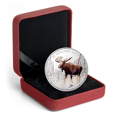 canada-elch-1-oz-silber-koloriert-etuiWie seine realen Vorbilder, die Temperaturen bis rund minus 50 Grad Celsius aushalten, lässt sich der Elch auf der Silbermünze von Schnee und Winter nicht aus der Ruhe bringen, sondern marschiert unbeirrt dem Betrachter entgegen. 38 Millimeter Platz im Durchmesser bietet ihm die Münze dafür. Das Sammlerstück ist in höchster Proof-Qualität geprägt und hat einen Feingehalt von 99,99 Prozent. Der Nennwert liegt bei 20 CAD.