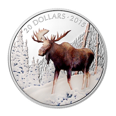 Die kolorierte Münze aus 1 oz Feinsilber zeigt ein winterliches Motiv: Ein Elchbulle stapft unbeeindruckt von Schnee und Eis über eine Waldlichtung. Im Hintergrund sind tief verschneite Bäume zu sehen. Der Elch ist an seinen mächtigen Schaufeln, der großen Nase und dem markanten Bart sofort zu erkennen. Auch der typische „Buckel“, wo die starken Muskeln ansetzen, ist gut zu sehen. Elchbullen bringen in Kanada im Schnitt stolze 600 Kilogramm auf die Waage. Die Kraft und Ruhe des Tiers ist in dem mit Farbapplikationen und verschiedenen Finishes gestalteten Motiv gut eingefangen.