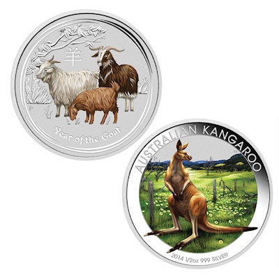 Die Känguru-Münze ist komplett koloriert und zeigt das namengebende Tier vor einer ländlichen Szene mit Wiese, Wildblumen, Zaun und Bergen im Hintergrund. Auf der Lunar-Münze sind nur die drei Ziegen mit Farbapplikationen gestaltet, während die Landschaft silbern bleibt. Ziegen und Kängurus sind in Australien übrigens auch in freier Wildbahn Nachbarn: Mit den Europäern kamen verschiedene Ziegenrassen auf den Kontinent und im Laufe der Zeit entstand eine große Wildziegenpopulation. Da die Tiere in trockenen Gegenden sehr gut zurecht kommen, stellen sie teilweise einen gefährlichen Nahrungskonkurrenten für die einheimischen Arten dar. Besonders das Gelbfuß-Felskänguru scheint mancherorts durch große Ziegenpopulationen bedroht. Andererseits ist die Produktion von Ziegenfleisch und anderen Produkten heute auch ein wichtiger Wirtschaftszweig in Australien.