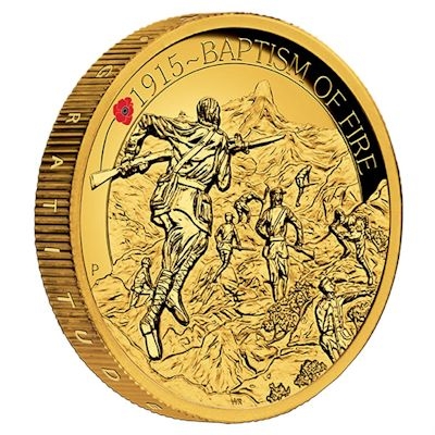 Jedes Jahr am 25. April feiert Australien den ANZAC Day und ehrt damit die Soldaten des Ersten Weltkriegs, die im Australian and New Zealand Army Corps kämpften. Hundert Jahre nach den Ereignissen bringt die Perth Mint eine Münzserie heraus, die an die Schlacht auf den Dardanellen erinnert. Dazu gehört auch diese eindrucksvolle Goldmünze in High-Relief-Prägung mit dem Titel „Baptism of Fire“, von der nur 100 Exemplare ausgegeben werden.