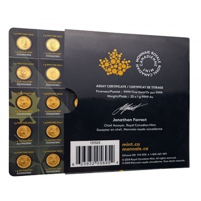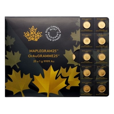 Praktisch für Edelmetall-Investoren und Sammler: Die Royal Canadian Mint bietet die beliebte Anlagemünze Maple Leaf jetzt in einer neuen Blister-Verpackung an: 25 Goldmünzen aus jeweils 1 Gramm Feingold sind gemeinsam verpackt, können aber einzeln abgetrennt werden. Die „Maplegrams“ haben jeweils eine eigene Seriennummer und zeigen das bekannte Motiv der kanadischen Anlagemünze.