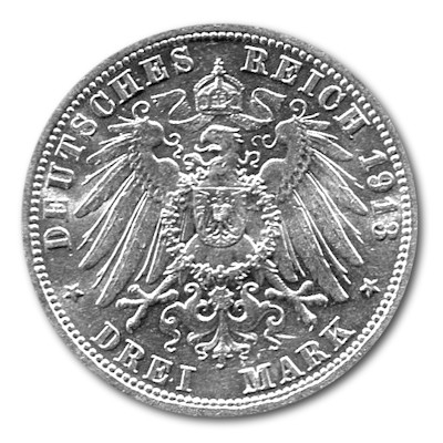 Zum 25-jährigen Thronjubiläum Kaiser Wilhelms II wurde 1913 eine 3-Mark-Münze herausgegeben, auf der der Monarch in der Uniform der Garde du Corps abgebildet ist. Das A steht für die Prägestätte Berlin. 1914 wurde dasselbe Motiv ohne den Lorbeerzweig geprägt. Umseitig ist, wie auf den Münzen des Kaiserreichs üblich, der Reichsadler zu sehen. Die Randbeschriftung lautet „Gott mit uns.“