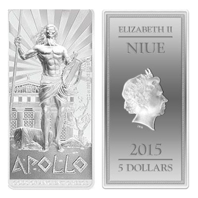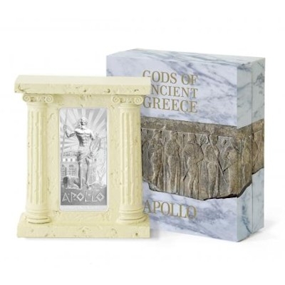 gods-of-ancient-greece-apollo-2-oz-silber-etuiNeben dem Tempel zeigt das Motiv auch noch einen Lorbeerbaum, das Symbol des Gottes. Nach Zeus, Aphrodite, Athene und Poseidon ist Apoll bereits die fünfte und damit letzte Ausgabe der Serie. Die Silbermünze in Barrenform enthält 2 oz Feinsilber (Feingehalt 999/1000). Sie wird in höchster Proof-Qualität geprägt, die das aufwendige Motiv zur Geltung bringt. Die Maße betragen 70 mal 34 Millimeter. Umseitig ist ein Porträt von Queen Elizabeth II zu sehen, die das offizielle Staatsoberhaupt des Ausgabelandes Niue ist. Der Nennwert liegt bei 5 Dollars. Das Sammlerstück lässt sich dank des mit griechischen Säulen gestalteten Etuis wunderbar präsentieren.