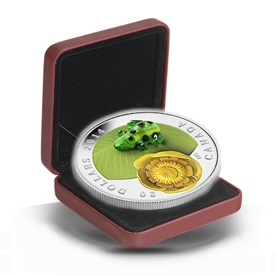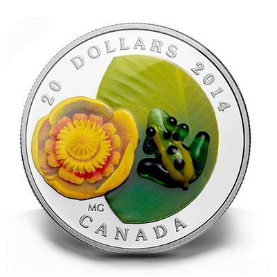 Feinsilber und edles Glas – 2011 startete die Royal Canadian Mint eine besondere Sammler-Serie: Das kolorierte Motiv der Silbermünzen zeigt einheimische Flora, „Stars“ der Serie sind jedoch Tiere, die aus echtem Muranoglas gefertigt und auf die Silbermünze aufgebracht sind. Nach Marienkäfer, Hummel und Schmetterling entschied man sich 2014 für einen Frosch auf einer Seerose.