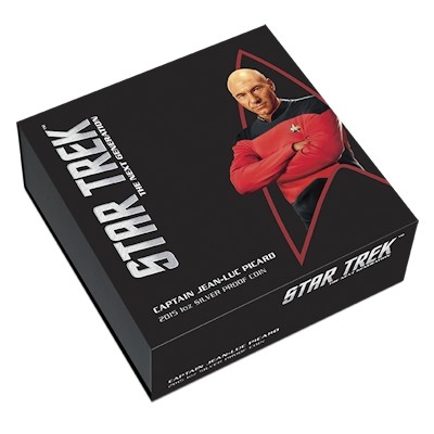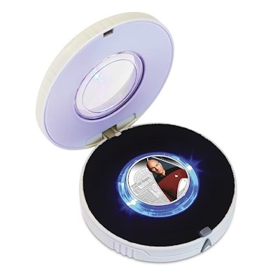 star-trek-jean-luc-picard-1-oz-silber-etuiAuf der Silbermünze ist Captain Picard innerhalb eines kolorierten Fensters abgebildet, das die Umrisse des Sternenflotten-Emblems hat. Er trägt seine rote Kapitänsuniform und blickt streng geradeaus. Auf der silbernen Hälfte der Münze findet man eine Darstellung der Enterprise und die Aufschrift „Captain Jean-Luc Picard“. Eingebettet ist dieses Motiv in ein rundes Etui mit Leuchtdiode: Wenn man den Deckel aufklappt, wird der Captain in blaues Licht getaucht.