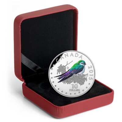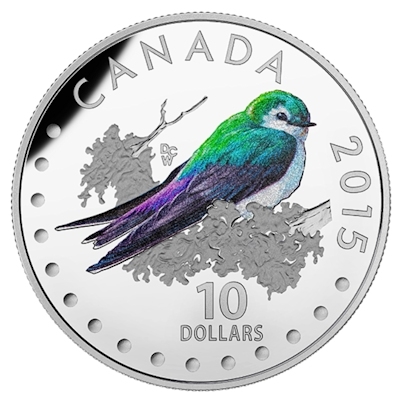 singvogel-veilchenschwalbe-half-oz-silber-umseitigDie Silbermünze präsentiert die wunderschön kolorierte Veilchenschwalbe auf einem mit Flechten bedeckten Ast. Sie hat einen Durchmesser von 34 Millimetern und enthält eine halbe Unze Feinsilber (Feingehalt 99,99 Prozent). Unter dem Vogel ist der Nennwert von 10 CAD verzeichnet, umseitig zeigt die Münze ein Portrait der Queen. Die Auflage ist auf 15.000 Stück weltweit begrenzt. Weitere Ausgaben der Serie zeigen Rotkardinal, Magnolien-Waldsänger, Blauhäher und Baltimore-Trupial.