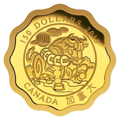 Das Design der Lotos-förmigen Goldmünze vereint verschiedene chinesische Glückssymbole: Der Ochse im Zentrum steht für eine reiche Ernte im kommenden Jahr. Er gehört auch zu den zwölf chinesischen Tierkreiszeichen. Am Zaumzeug des Tieres sind fünf Käschmünzen befestigt. Diese Münzen mit einem quadratischen Loch in der Mitte gelten heute als Glücksbringer und stehen als altes Zahlungsmittel natürlich auch für Wohlstand – ebenso wie das chinesische Schriftzeichen, das oben links in das Motiv integriert ist.