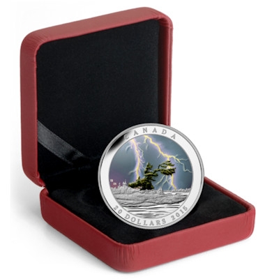 weather-phenomenon-1-oz-silber-koloriert-etuiIm Mittelpunkt des Motivs steht eine einsame Weymouth-Kiefer am Ufer der Georgian Bay in Ontario. Im Vordergrund ist das vom Wind gekräuselte Wasser des Huronsees zu erkennen, im Hintergrund deuten stilisierte Bäume weite Wälder an. Der vom Wind gebeugte Baum und der blauschwarze Gewitterhimmel sind koloriert. Den Mittelpunkt des Bildes bilden zuckende Blitze – an sich schon eindrucksvoll gestaltet, entfalten sie ihre ganze Strahlkraft, wenn die Münze mit Schwarzlicht beleuchtet wird. Diese Technik bringt die Royal Canadian Mint hier zum ersten Mal zum Einsatz.