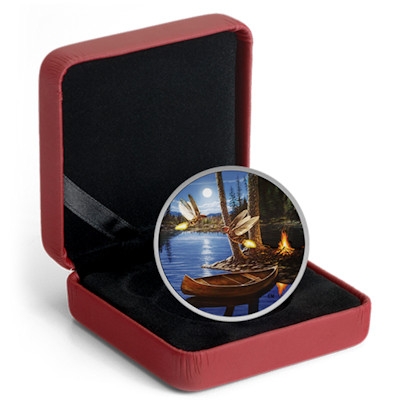 moonlight-fireflies-2-oz-silber-koloriert-etuiNaturmotive stehen bei den Kanadiern hoch im Kurs – schließlich bietet das dünn besiedelte Land auch jede Menge Gelegenheit für Outdoor-Abenteuer. Dazu gehören unbedingt Kanutouren und Camping in der Wildnis. So zeigt auch die Silbermünze ein Lagerfeuer am Fluss und ein Boot, das die Camper in die einsame Gegend gebracht hat. Am Himmel steht der Vollmond, der sich im ruhigen Wasser spiegelt, der Vordergrund gehört zwei Glühwürmchen, die sich wie im Tanz aufeinander zubewegen. Sie gehören zur häufigsten kanadischen Leuchtkäferart Photinus pyralis. Ihre braunen Körper und feinen Flügel sind liebevoll gezeichnet.