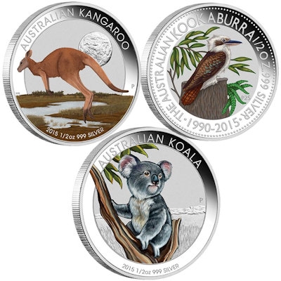 Die drei beliebtesten australischen Silbermünzen-Motive haben sich wieder zu einem Set zusammengefunden: Känguru, Koala und Kookaburra präsentiert die Perth Mint auch dieses Jahr gemeinsam als „Australian Outback“-Kollektion. Die Münzen enthalten jeweils 1/2 oz Feinsilber und zeigen in diesem Jahr ein mit Farbapplikationen gestaltetes Motiv. Die Auflage beträgt nur 2.000 Stück. Laut Prägeanstalt wird die beliebte Kollektion 2015 außerdem zum letzten Mal ausgegeben.