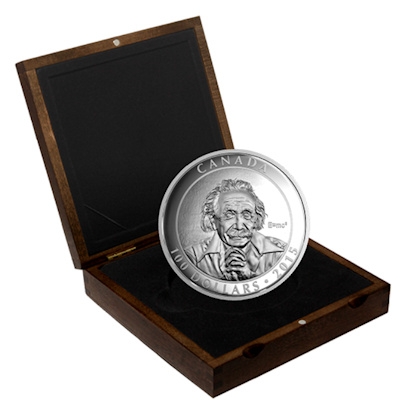Mit großer Sorgfalt und Liebe zum Detail wurde die Fotografie, die auf der Umverpackung zu sehen ist, auf das Silber übertragen. Das Sammlerstück aus 10 oz Feinsilber hat einen Feingehalt von 99,99 Prozent. Der Durchmesser beträgt 76,25 Millimeter. Die Silbermünze ist in Proof-Qualität geprägt. Der Nennwert liegt bei 100 CAD. Ausgeliefert wird die Einstein-Münze in einem stilvollen Holzetui. Die Auflage ist streng limitiert auf 1.500 Exemplare weltweit.