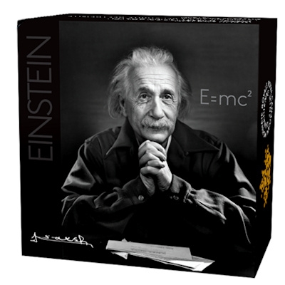 Karsh war einer der wichtigsten Portraitfotografen des 20. Jahrhunderts, Berühmtheiten aus Politik und Showgeschäft standen regelmäßig vor der Kamera des gebürtigen Armeniers, darunter Winston Churchill, John F. Kennedy, Picasso und Grace Kelly. Albert Einstein fotografierte er 1948 in Princeton, lange nachdem der 1879 in Ulm geborene Wissenschaftler seine bahnbrechenden Theorien veröffentlicht, den Nobelpreis gewonnen und Europa nach der Machtübernahme der Nazis den Rücken gekehrt hatte. Karsh berichtete, er habe den Wissenschaftler mit verknitterten Kleidern, ohne Socken und mit ungekämmten Haaren angetroffen. Einen Kamm lehnte Einstein mit der Begründung ab, er benutze nie einen. Seine Frisur auf den Bildern ist dementsprechend wild, ansonsten wirkt er mit den gefalteten Händen und dem melancholischen Blick in sich gekehrt. Karsh inszenierte ihn weniger als exzentrisches Genie, eher als weisen Mann. Wohlwollend und auch ein bisschen traurig blickt er nun von der wunderschön gestalteten Silbermünze auf die Münzsammler. Als weiteres Detail ist die berühmte Formel E = mc², die bereits in der Speziellen Relativitätstheorie von 1905 veröffentlicht wurde, in das Motiv integriert.