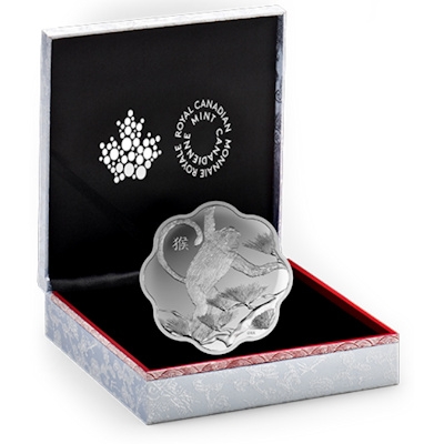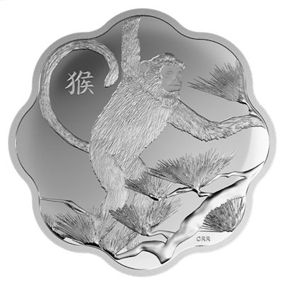 Das Motiv der Silbermünze, die in höchster Proof-Qualität geprägt wird, zeigt einen detailreich dargestellten Affen auf einem Baum. Umrahmt von seinem Schwanz ist das chinesische Schriftzeichen für Affe zu sehen. Das Motiv ähnelt einem chinesischen Stumpfnasenaffen und ist auch auf einer Ausgabe aus 1 kg Silber erhältlich, die mit roter Emaille verziert ist. Weitere Affenmünzen aus Kanada zeigen ein eher verspieltes Bild des listigen Affen. Menschen, die unter seinem Zeichen geboren sind, gelten als charismatisch, erfindungsreich und als angenehme Gesellschaft.