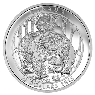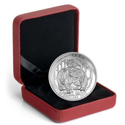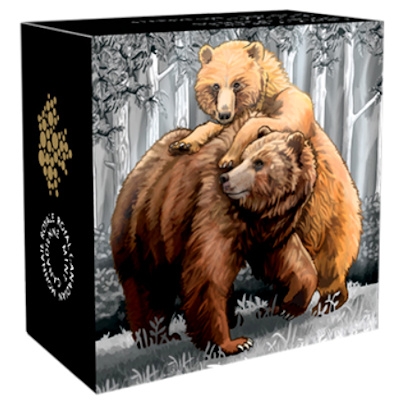 Das Motiv ist von einem glatten Rand umgeben, auf dem unten der Nennwert von 20 Dollars zu finden ist. Die Silbermünze enthält 1 oz Feinsilber (Feingehalt 99,99 Prozent) und hat einen Durchmesser von 38 Millimetern. Das in höchster Proof-Qualität geprägte Sammlerstück wird im Etui und mit einem Karton ausgegeben. Die Umverpackung greift das Grizzly-Motiv noch einmal auf und zeigt die beiden Bären in Farbe. Die Auflage ist auf 6.500 Exemplare limitiert.