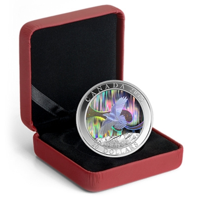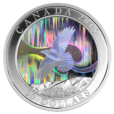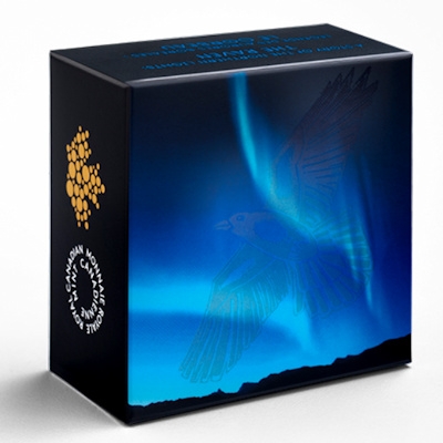 Im Zentrum des Motivs steht diesmal der Rabe. Die First Nations, vor allem die Stämme im Westen Kanadas, erzählen viele Geschichten über den schwarzen Vogel. Oft ist er der Schöpfer des Landes, entdeckt die ersten Menschen in einer Muschel oder bringt ihnen frisches Wasser und Feuer. Einigen Legenden nach war es auch der Rabe, der Sonne, Mond und Sterne an den Himmel hängte. Wie Vorhänge aus Licht ergießen sich die Polarlichter hinter dem Raben über den Himmel. In der Natur entsteht die Aurora, wenn geladene Teilchen des Sonnenwinds auf die Erdatmosphäre treffen. Hier waren die Spezialisten der Royal Canadian Mint am Werk: Mit Nanotechnologie wird das Hologramm in die Münzoberfläche eingearbeitet – ein faszinierender Effekt, der im wahrsten Sinne des Wortes im Auge des Betrachters liegt, entsteht.