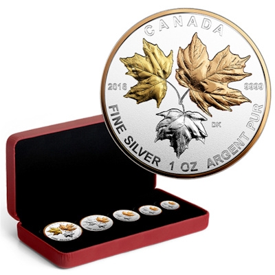Der Herbst ist da, die Blätter verfärben sich – und in Kanada nehmen sie besonders prächtige Schattierungen an. Das gilt nicht nur für die draußen an den Bäume im Indian Summer, sondern auch für die Ahornblätter der Royal Canadian Mint. Auf einem neuen, fünfteiligen Silbermünzen-Set sind sie mit Roségold und Gelbgold gestaltet. Auch die Rückseite ist bei diesen Sammlerstücken etwas ganz Besonderes: Anlässlich des Thronrekords der Queen zeigt sie ein Porträt ihrer Majestät von 1953, dem Jahr ihrer Krönung.
