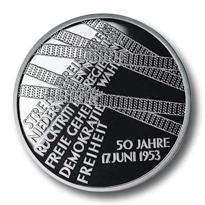 50-jahre-volksaufstand-silberEinen Nennwert von 20 Euro haben die Goldmünzen der Serie Deutscher Wald. Die letzte Ausgabe dieser Serie aus 1/8 oz Feingold zeigt die Linde. Die Alten Buchenwälder Deutschlands – im Osten wie im Westen – gehören überigens zum Weltnaturerbe der UNESCO. Verschiedenen Themen widmen sich die 10-Euro-Silbermünzen aus Deutschland. Hier reicht das Motivspektrum von Grimms Märchen bis zur Fußball-WM, vom Deutschen Museum bis zu Robert Schumann und vom Ruhrgebiet bis zum Volksaufstand – auch hier sind also Themen aus Ost und West, aus Geschichte und Gegenwart vereint.