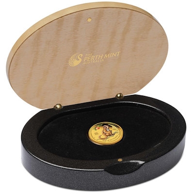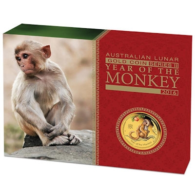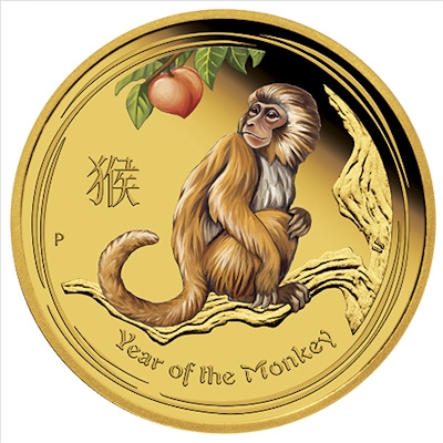 Der Affe auf der Goldmünze blickt über seine Schulter zurück zu einem Pfirsich, der oben an einem Zweig hängt. Beide – Affe und Pfirsich – sind mit liebevollen Farbapplikationen gestaltet. Links findet man das chinesische Schriftzeichen für Affe. Am unteren Rand entlang ist außerdem der Schriftzug „Year of the Monkey“ zu sehen. Die Goldmümze aus 1 oz Feingold hat einen Durchmesser von 39,34 Millimetern und eine Dicke von 2,5 Millimetern. Der Feingehalt liegt bei 99,99 Prozent. Der Münzrand ist geriffelt. Umseitig findet man den Nennwert von 100 Dollars unter dem Portrait von Königin Elizabeth II. Die in höchster Proof-Qualität geprägte Münze wird im stilvollen Etui und Karton im Seriendesign ausgeliefert. Die Auflage ist bei der Ausgabe aus 1 oz auf 3.000 Stück begrenzt, von den anderen Stückelungen werden jeweils 5.000 ausgegeben.