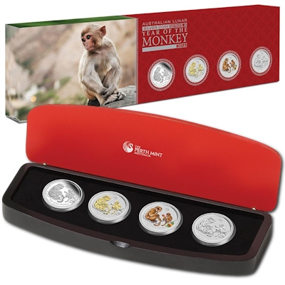 2016 wird ein Affenjahr. Für alle Fans der schlauen Tiere, und für alle, die unter ihrem Zeichen geboren sind, sind die neuen Lunar-Ausgaben der Perth Mint eine ideale Geschenkidee. Wer sich nicht für eine Variante entscheiden will, liegt mit diesem Silber-Set auf jeden Fall richtig: Es enthält vier Sammlerstücke aus jeweils 1 oz Feinsilber mit Farbapplikationen und Vergoldung, in Proof- und in BU-Prägung. Die Auflage für das Set ist auf 1.500 Stück begrenzt.