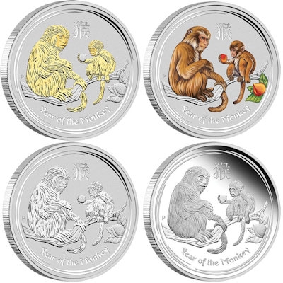Der Affe kam als neunter Gast zu Buddhas Gastmahl, deshalb steht das neunte Jahr unter seinem Zeichen. 2016 ist es wieder so weit. Der Affe gilt in der chinesischen Astrologie als schlau und optimistisch – so schaffte er es einer Legende nach auch, von den Pfirsichen der Unsterblichkeit zu naschen. Das Motiv der Perth Mint zeigt deshalb einen Affen und ein Äffchen auf einem Pfirsichbaum. Der kleine Affe hält eine der Früchte in der Hand.