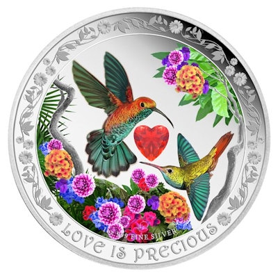 Kolibris umwerben ihre Partnerin mit einem eleganten Balztanz – dieser könnte das Vorbild für das Münzmotiv gewesen sein. Jedenfalls präsentieren die Vögel wunderbar ihr farbenfrohes Gefieder. Zusammen bilden sie mit ihren Körpern und typischen langen Schnäbeln einen Kreis um das rote Herz in der Mitte. Dieses Zirkonia-Herz ist in die Silbermünze eingelegt. Die Kolibris sind umgeben von üppigen bunten Blüten. Ein silberner Rand mit Blumenranken umgibt dieses farbige Motiv. Unten ist die Aufschrift „Love is precious“ zu finden.