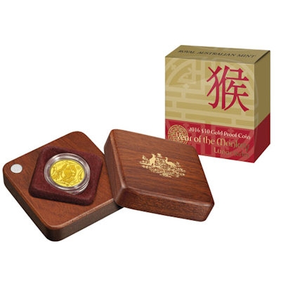 royal-australian mint-year-of-the-monkey-gold-etuiDie in höchster Proof-Qualität geprägte Goldmünze ist eine wertvolle Geschenkidee für alle, die im Jahr des Affen geboren sind. Sie hat einen Durchmesser von 17,53 Millimetern und enthält 1/10 oz Feingold. Der Nennwert von 10 Dollars ist umseitig unter einem Porträt von Königin Elizabeth II zu finden. Die Sammlerstücke werden mit nummeriertem Echtheitszertifikat und in einem stilvollen Etui ausgeliefert. Die Auflage ist streng limitiert auf 1.500 Stück weltweit.