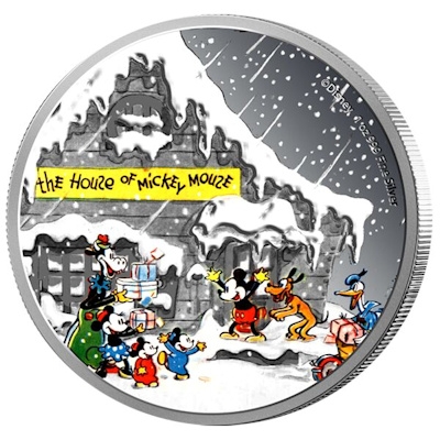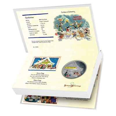 disney-seasons-greetings-classic-1-oz-silber-koloriert-etuiDas Motiv wurde auf die Silbermünze mit einem Durchmesser von 40 Millimetern eingepasst; auf dem Etui ist die Karte noch einmal komplett zu sehen. Das Sammlerstück enthält 1 oz Feinsilber (Feingehalt 999/1000) und trägt den Nennwert von 2 Neuseelanddollars. Ausgabeland ist der Inselstaat Niue. Auf der Wertseite ist Königin Elizabeth II. abgebildet. Die Münzen werden in einem hübschen Etui ausgeliefert, dessen Deckel die Weihnachtskarte zeigt. Die Auflage ist auf 10.000 Exemplare limitiert.