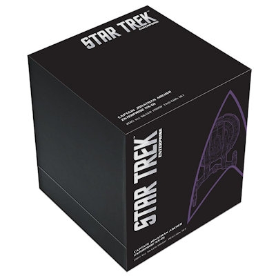 Die neueste der fünf Star-Trek-Realfilmserien ist gleichzeitig die älteste: Enterprise zeigt die Anfänge der Sternenflotte, vor der glorreichen Zeit von Captain Kirk, sogar noch vor den Zeiten der interplanetaren Föderation und der obersten Direktive. Nach Raumschiff Enterprise, Enterprise – The Next Generation, Deep Space Nine und Raumschiff Voyager sind jetzt auch Captain Archer und die Enterprise NX-01 auf Silber erhältlich. Besonders schön präsentiert werden die beiden kolorierten Silbermünzen im Set, das wie ein Star-Trek-Transporter gestaltet ist. Die Auflage dieses Silber-Sets ist auf nur 1.500 Stück