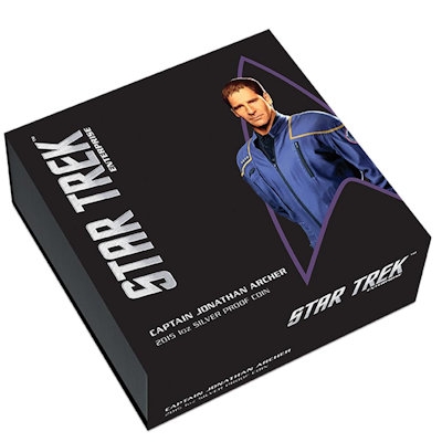 star-trek-captain-archer-1-oz-silber-koloriert-verpackungDargestellt wurde der Captain in den vier Staffel der Serie „Star Trek: Enterprise“ von Scott Bakula. Er steht auf der Silbermünze leicht seitlich zum Betrachter in einem kolorierten Fenster und zeigt einen entschlossenen Gesichtsausdruck. Auf der silbernen Hälfte des Motivs ist sein Schiff, die Enterprise, abgebildet. Die Silbermünze hat einen Durchmesser von 40,60 Millimetern und enthält 1 oz Feinsilber bei einem Feingehalt von 999/1000. Ausgabeland ist der Inselstaat Tuvalu. Sie wird in einem runden Etui mit einer Leuchtdiode ausgeliefert. Die Auflage beträgt 5.000 Stück. Dazu kommen noch einmal 1.500 Exemplare, die im Set mit der Ausgabe Enterprise NX-01 ausgeliefert werden.