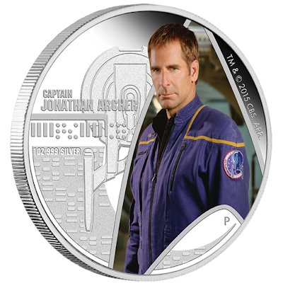 star-trek-captain-archer-1-oz-silber-koloriertCaptain Archer übernimmt das Kommando in der Star Trek Silbermünzen-Serie. Nach Kirk, Picard, Sisko und Janeway ist damit auch der fünfte Fernseh-Captain auf Silber erhältlich. Wie die Vorgänger-Ausgaben ist die Sammlermünze mit aufwendigen Farbapplikationen gestaltet und aus 1 oz Feinsilber in höchster Proof-Qualität geprägt. Die Auflage ist auf 5.000 Exemplare limitiert. Außerdem ist die Silbermünze in einem Set mit Enterprise NX-01 erhältlich.