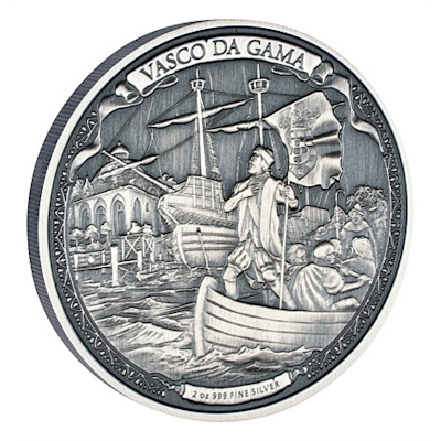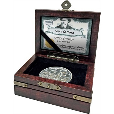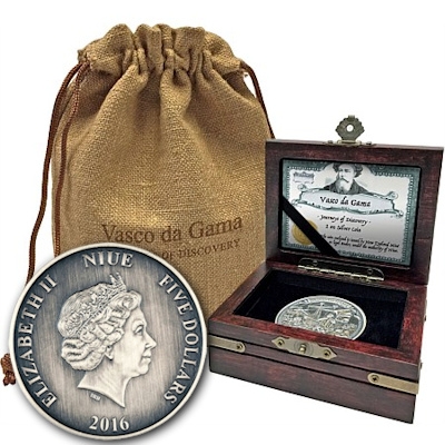 Vasco da Gama unternahm noch zwei weitere Reisen nach Indien; von der letzten sollte er nicht lebend zurückkehren. Die Silbermünze zeigt ihn mit Flagge in der Hand und stolz geschwellter Brust am Bug eines Bootes, das Schiff liegt im Hintergrund vertäut. Das Sammlerstück aus 2 Unzen Feinsilber (Feingehalt 999/1000) hat einen Durchmesser von 40 Millimetern. Es ist in High-Relief geprägt und mit einem Antik-Finish versehen. Umseitig ist ein Porträt von Königin Elizabeth II. abgebildet; als Ausgabeland gilt Niue. Der Nennwert liegt bei 5 Dollars. Die Verpackung rundet das Gesamtkonzept wunderbar ab: Das Etui ist wie ein hölzernes Schatzkästchen mit Beschlägen gestaltet. Die Umverpackung besteht aus einem Beutel mit Kordelzug. Die Auflage ist auf nur 2.000 Exemplare begrenzt.