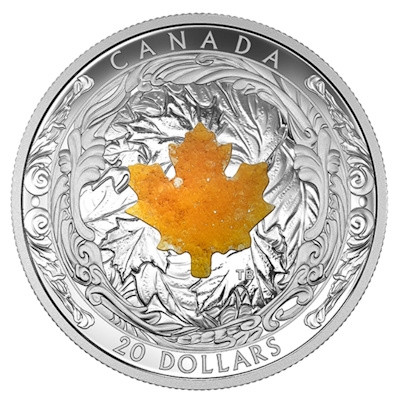 Als Druse bezeichnet man eine Kristallansammlung, die in einem Hohlraum im Gestein entsteht. Der Halbedelstein zeichnet sich durch seinen besonderen Schimmer aus, der an Zucker oder frisch gefallenen Schnee erinnert. Das Ahornblatt aus goldgelbem Stein bildet den Mittelpunkt des Motivs der Silbermünze und verleiht ihr ein herbstliches Aussehen. Es ist umgeben von herumwirbelnden silbernen Blättern, die ihrerseits von Ornamenten im Art-Nouveau-Stil eingerahmt sind. So entsteht ein detailreiches, dynamisches und gleichzeitig kunstvolles Motiv.