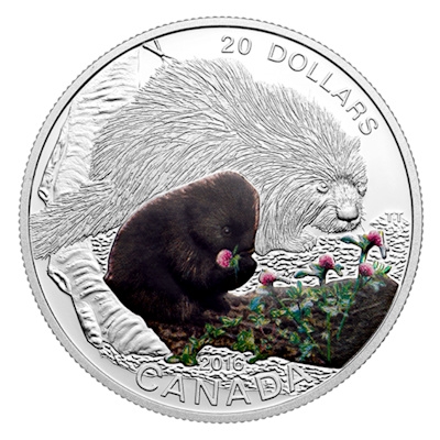 Erethizon dorsatum ist ein in Kanada und dem Norden der USA verbreitetes Baumstachelschwein, das bis zu einem Meter lang wird. Die großen Nagetiere verdanken ihren Namen den bis zu 30.000 mit Widerhaken versehenen Stacheln, die sie am Rücken und Schwanz tragen. Damit können sich schon die Jungtiere verteidigen. Die Silbermünze zeigt ein koloriertes Baby-Stachelschwein mit dunklem Fell im Vordergrund. Seine Aufmerksamkeit ist ganz auf einige ebenfalls mit Farbapplikationen gestaltete Kleeblüten gerichtet. Im Hintergrund scheint die Mutter, die in Silber gestaltet ist, den Betrachter der Silbermünze misstrauisch zu beobachten.