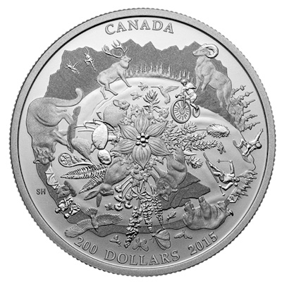 Den Mittelpunkt des Motivs bildet eine Hartriegel-Blüte. Rundherum findet man typische Pflanzen und Tiere der kanadischen Bergwelt, dazu Freizeitaktivitäten und schließlich Bergpanoramen. Fuchs, Pika, Meise und Hirsch findet man hier genauso wie Adler, Bergziege, Puma und Dickhornschaf. Die Menschen sind als Snowboarder und Skifahrer, Camper und Kletterer unterwegs. Aus jeder Perspektive entdeckt man als Betrachter neue Details auf der Silbermünze. Ganz unten ist am Rand entlang der Nennwert von 200 CAD verzeichnet.