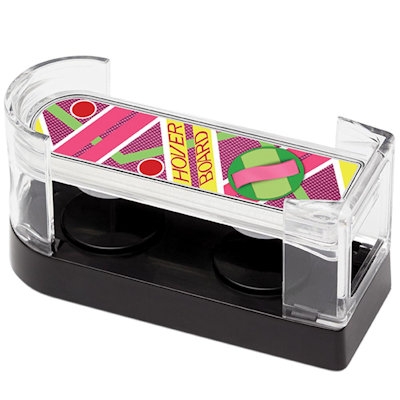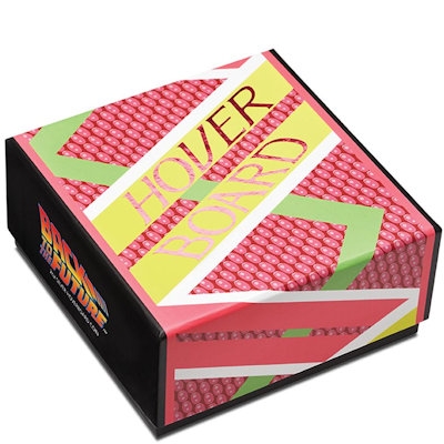 Im zweiten Teil von „Zurück in die Zukunft“ reist Marty McFly, gespielt von Micheal J. Fox, aus dem Jahr 1985 ins Jahr 2015. Die Hoverboards genannten schwebenden Skateboards sind eine Erfindung des Films – in diesem Punkt haben die Drehbuchautoren die technischen Entwicklungen wohl etwas zu optimistisch eingeschätzt. Inzwischen gibt es zwar Prototypen für echte Hoverboards, ein Einsatz wie im Film gezeigt liegt aber noch in weiter Ferne. Das Design des silbernen Sammlerstücks ist jedenfalls an das Filmboard angelehnt; es handelt sich um ein lizensiertes Produkt.