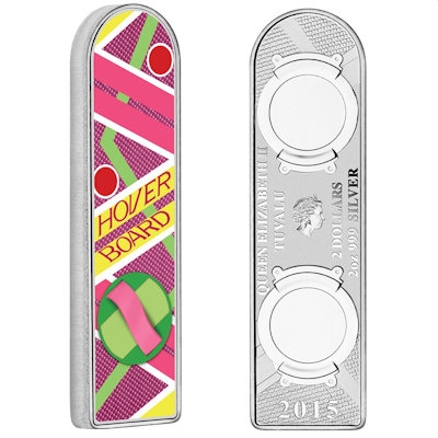 Die Silbermünze hat die Maße von 22,50 x 80,50 x 4,00 Millimetern. Sie enthält 2 oz Feinsilber und hat einen Feingehalt von 999/1000. Auch die silberne Wertseite ist wie das Hoverboard gestaltet, trägt in der Mitte jedoch ein Porträt von Königin Elizabeth II. sowie den Nennwert von 2 Dollars in der Währung des Ausgabelandes Tuvalu. Die Auflage ist passend zum Thema auf genau 2015 Stück limitiert. Sie werden mit magnetischem Etui, Umverpackung und nummeriertem Echtheitszertifikat ausgeliefert.