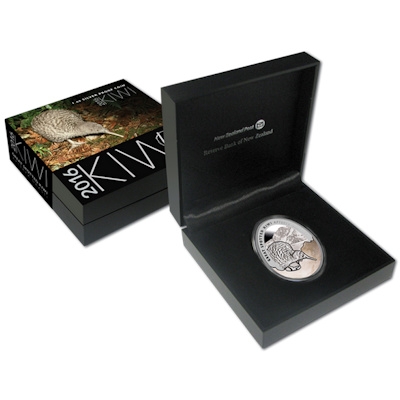 Das Motiv ist teilweise koloriert und zeigt im Vordergrund einen Kiwi, im Hintergrund schneebedeckte Berge. Durch die Proof-Prägung kommen Details wie die feinen, fellartigen Federn des Vogels gut zur Geltung. Die Münze misst 34 x 45 Millimeter und enthält 1 oz Feinsilber bei einem Feingehalt von 999/1000. Der Nennwert von 1 Neuseeland-Dollar ist oberhalb des Kiwis zu finden, umseitig zeigt das Sammlerstück das Ian-Rank-Broadley-Porträt von Königin Elizabeth II. Ausgeliefert werden die Kiwis im Etui, mit Umverpackung und nummeriertem Echtheitszertifikat.