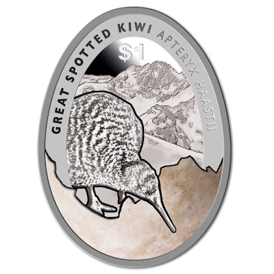 Der Haastkiwi (Apteryx haastii) wird auch als Großer Fleckenkiwi bezeichnet. Er kommt ausschließlich im Norden der neuseeländischen Südinsel vor und gilt als gefährdet. Die Weibchen dieser Art werden bis zu 60 cm groß, legen jedoch Eier, die über 12 cm groß sein können. Damit sind sie Weltrekordhalter im Tierreich. Wie ihre Verwandten ernähren sie sich hauptsächlich von Käfern und Larven, die sie mit ihrem langen, dünnen Schnabel in der Erde aufspüren. Wie auf dem Motiv der Silbermünze zu sehen ist, leben die Großen Fleckenkiwis auch in höher gelegenen Bergregionen.