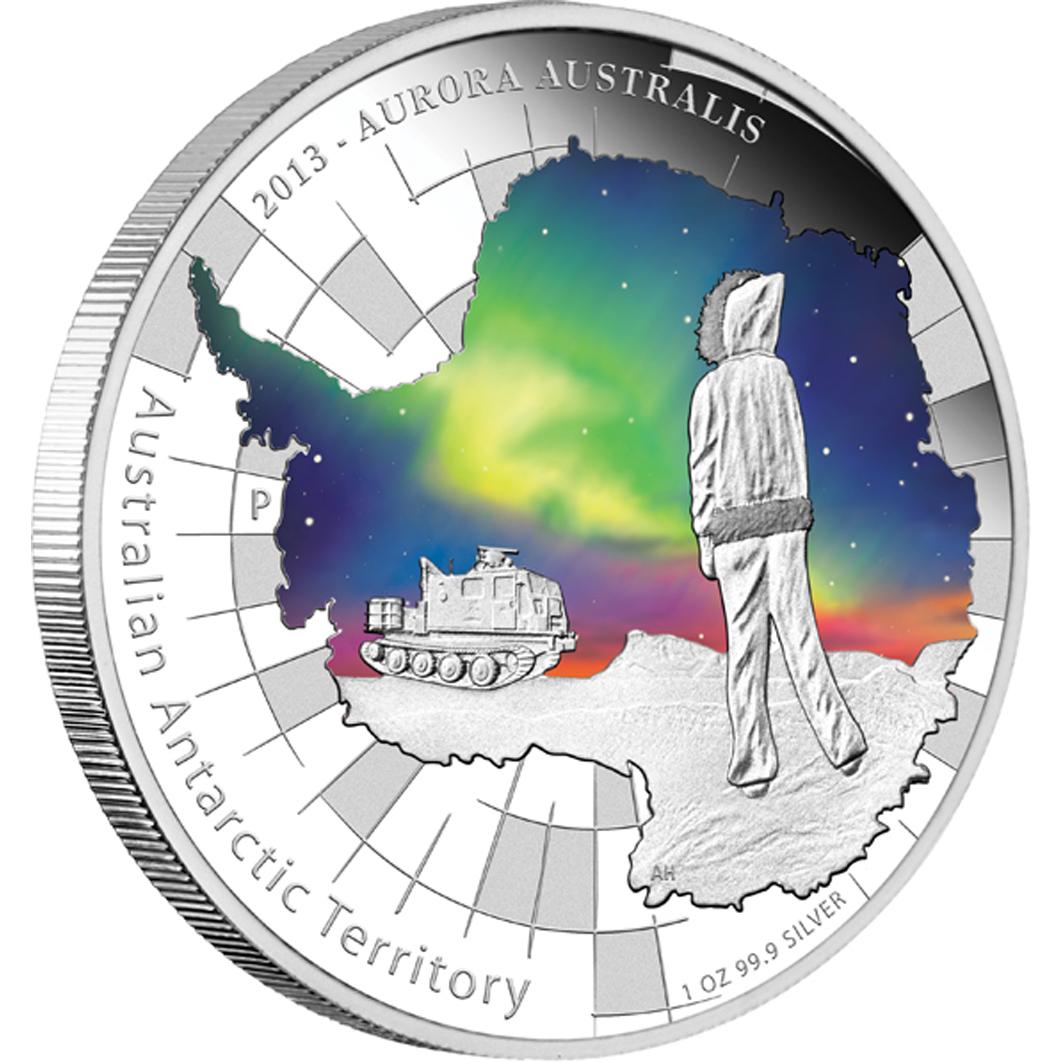 0-Australian-Antartic-Territory-Series-Aurora-Australis-Silver-Coin-ReverseDie Tage sind kurz, das Wetter rau – der Winter hat uns fest im Griff. Ständig in Schnee und Eis gehüllt ist die Antarktis. In diese eisige Welt entführt seit 2004 die Serie „Australian Antarctic Territory“ der Perth Mint mit leuchtend kolorierten Silbermünzen. Eine Unze reines Feinsilber (Feingehalt: 999/1000), geprägt in höchster Proof-Qualität – kein Wunder, dass die Ausgaben sich unter Münzsammlern großer Beliebtheit erfreuen.