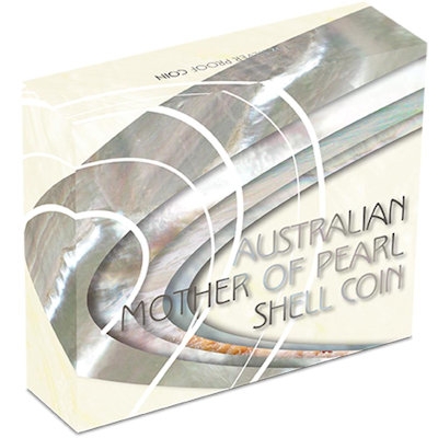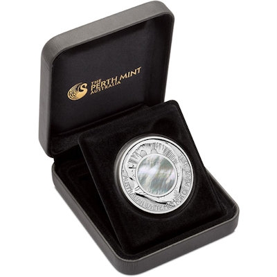 mother-of-pearl-shell-1-oz-silber-etuiPerlmutt bildet die innere Schicht der Schale einiger Weichtiere wie Austern, Abalone-Schnecken, Kreiselschnecken und Perlmuscheln. Es besteht hauptsächlich aus Calciumcarbonat, das durch einen Anteil aus organischem Material zusammenhält. Je nach Tierart und Region nimmt Perlmutt verschiedene Farben an, typisch ist jedoch immer der schillernde Glanz, wenn das Licht darauf fällt. Das lässt sich bei der Silbermünze, die mit weißem Perlmutt veredelt ist, schön nachvollziehen. Die faszinierenden Muschelschalen wurden in Australien schon von den Aborigines als Schmuck verwendet.